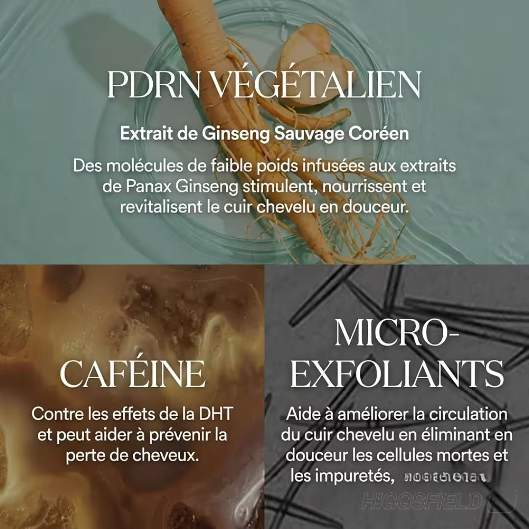 Le ginseng sauvage coréen est un ingrédient puissant qui stimule et revitalise le cuir chevelu grâce à ses molécules de faible poids. En nourrissant les racines et en améliorant la circulation sanguine, il aide à favoriser une croissance capillaire saine et naturelle, tout en apaisant le cuir chevelu pour un confort optima